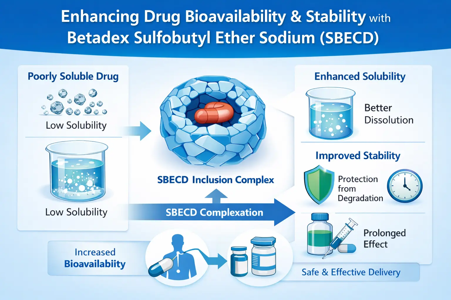 SBECD обично ја зголемува биорасположивоста со тоа што ги прави лековите порастворливи без премногу менување на патиштата на елиминација. Циклодекстрин е носач на лекови кој ја испушта активната хемикалија кога се меша со биолошки течности. Овој метод ги задржува природните фармаколошки својства на лекот додека ја подобрува испораката.