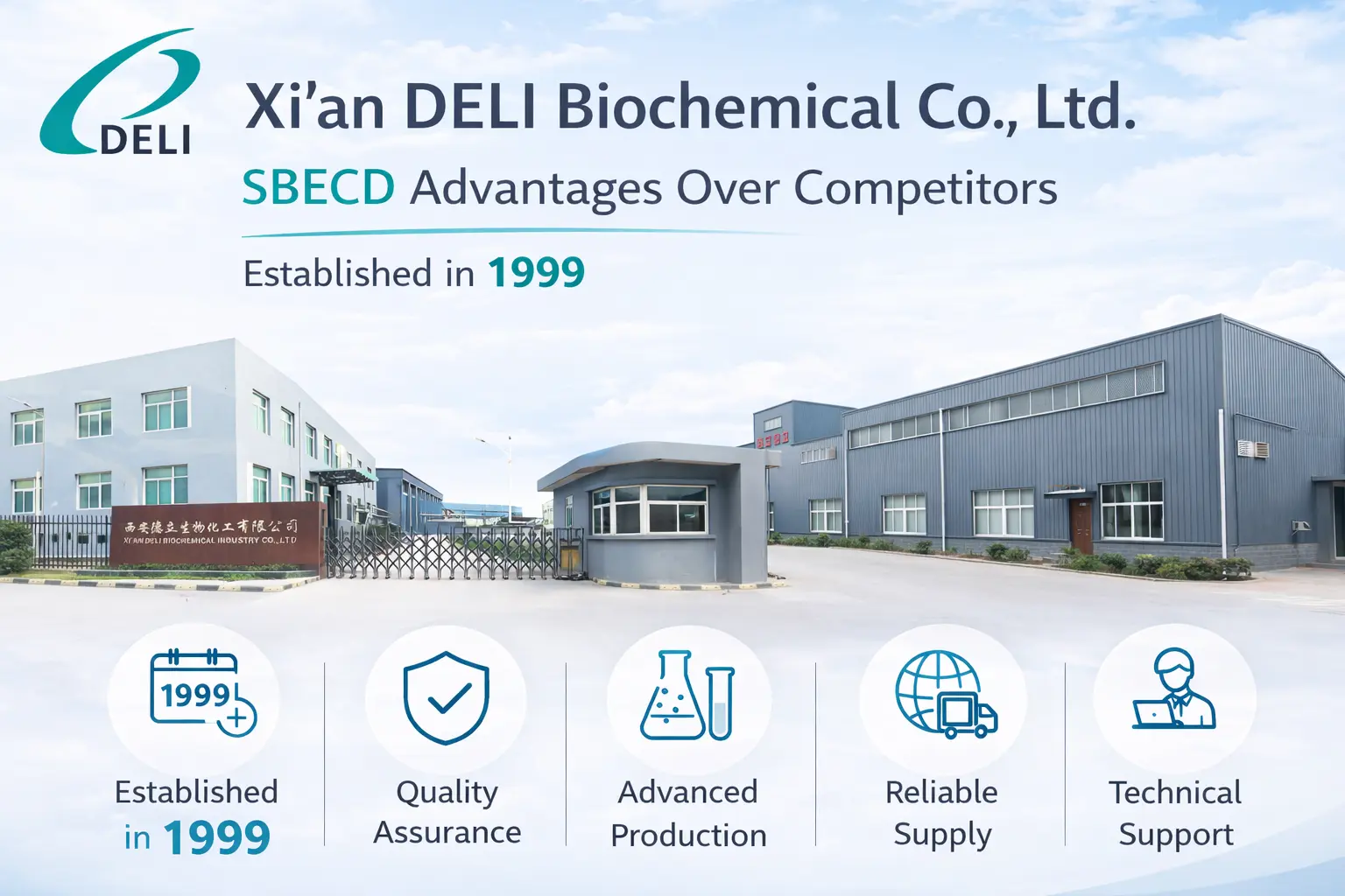 DELI Biochemical е една од најголемите компании што произведува Betadex Sulfobutyl Ether Sodium. Тие прават состојки за инјектирање кои ги исполнуваат најстрогите медицински стандарди. Ние сме најдобриот партнер за развој на нови лекови бидејќи се грижиме за квалитетот, сигурноста и задоволството на клиентите. Предноста на DELI може да ја добиете преку нашата целосна техничка помош и гарантирана сигурност во снабдувањето. Контактирајте не на xadl@xadl.com за да разговарате за вашите специфични потреби за формулација.